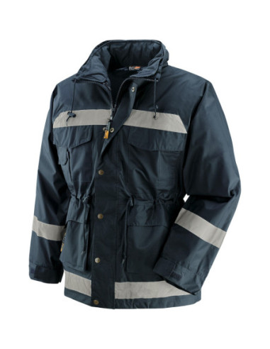 Giaccone in tessuto PVC/poliestere Interno staccabile INTERNO Imbottitura in poliestere Utilizzabile singolarmente con maniche lunghe 2 taschini sul davanti 1 taschino interno Chiusura con bottoni automatici GIACCONE ESTERNO Chiusura con cerniera e bottoni automatici Cappuccio staccabile Tasche esterne Maniche lunghe antipioggia Cuciture termosaldate Bande segnaletiche rifrangenti altezza 5 cm Colore: blu Taglie: S, M, L, XL, XXL