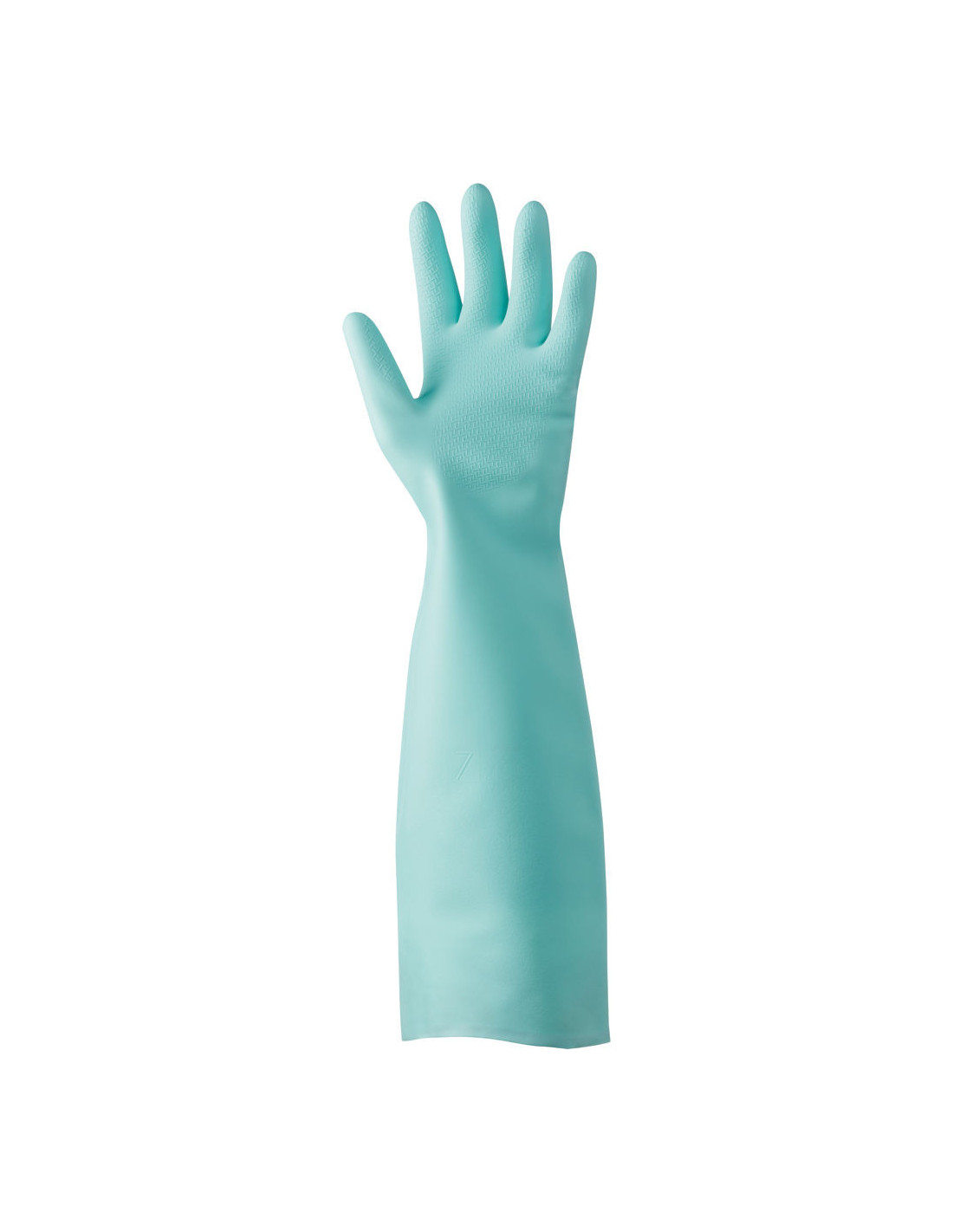 Art.349013 Ultranitril 480 Guanto in nitrile Finitura interna clorinata Zigrinatura esterna antiscivolo Conforme alla regolamentazione F.D.A. per il contatto alimentare Ottima protezione chimica Lunghezza 46 cm Spessore 0,55 mm Colore: verde Taglie: 7/7,5, T.8/8,5, T.9/9,5, T.10/10,5