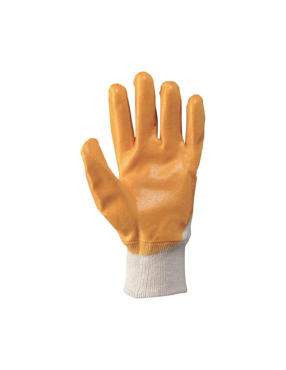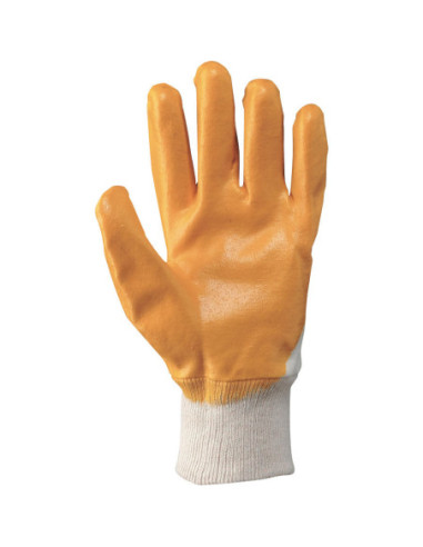 Guanto in tessuto jersey di cotone impregnato in NBR Palmo, dita e nocche ricoperte Modello economico Leggero Buona resistenza all'abrasione Polso elasticizzato e dorso parzialmente aerato Colore: bianco/giallo Taglie: T.7, T.8, T.9, T.10, T.11