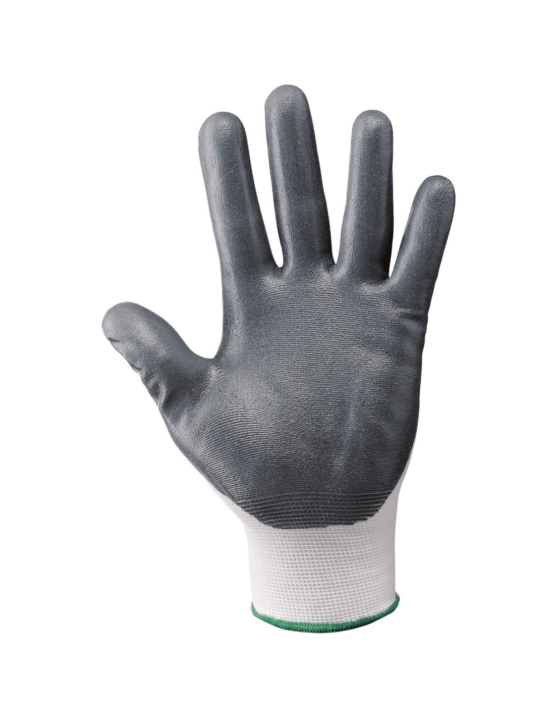 Guanto in filo continuo 100% nylon Palmo ricoperto in nitrile schiumato Polso elasticizzato Modello economico Colore: grigio chiaro EN 388 Resistenza meccanica 2122