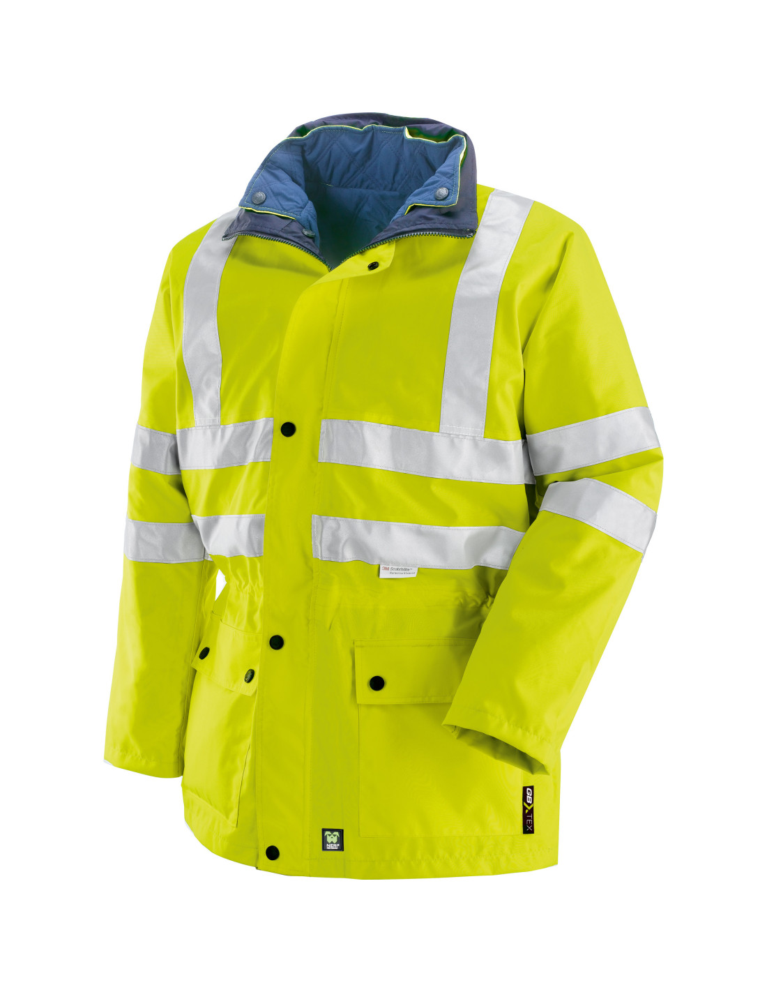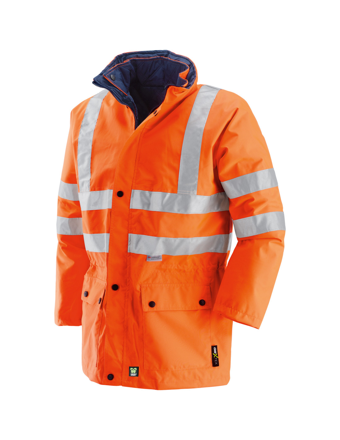 Giaccone triplo uso realizzato con tessuto GBTEX© (poliestere/poliuretano) INTERNO STACCABILE RIUTILIZZABILE Imbottitura in poliestere Maniche staccabili trapuntate di colore blu Chiusura con bottoni 2 tasche esterne sul davanti 1 banda retroriflettente (3M) orizzontale che avvolge completamente il torace 1 banda retroriflettente (3M) che passa sulle spalle ESTERNO Cappuccio all'interno del collo Chiusura con cerniera e bottoni automatici 2 tasche sul davanti con patta antipioggia Coulisse in vita 2 bande retrofiflettenti (3M) orizzontali che avvolgono completamente il torace 1 banda retroriflettente (3M) che passa sulle spalle 2 bande retroriflettenti (3M) orizzontali che avvolgono entrambe le maniche Colore: arancio Taglie: S, M, L, XL, XXL, XXXL EN471:2003+A1:2007 32 EN343:2003+A1:2007 32