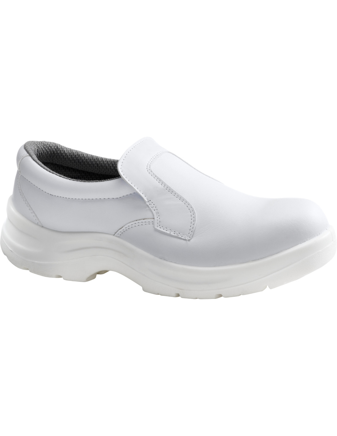 "Fodera interna traspirante, idrofila, antiumiditö. Soletta interna amovibile, antistatica con trattamento antibatterico. Suola in poliuretano monodensitö. Puntale in acciaio. Chiusura con elastico tipo ""Sleep-on"". Lavabile in lavatrice. Conforme alla normativa EN ISO 20345 : 2011 Taglie:dalla 36 alla 46 Colore: bianco."